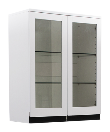Till överskåpen och högskåpen kan du välja mellan öppna hyllor eller vitrinluckor med antikbehandlat glas.